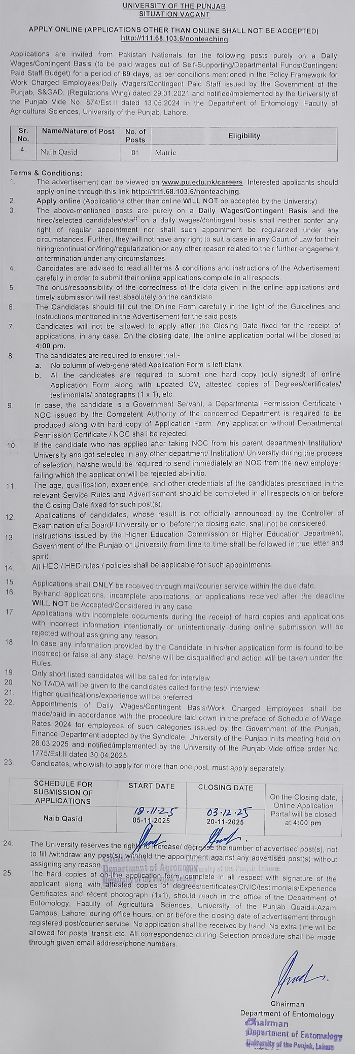 Careers SITUATION VACANT - Naib Qasid (posts purely on a Daily Wages / Contingent Basis) Job Type: SITUATION VACANT - Naib Qasid (posts purely on a Daily Wages / Contingent Basis)No. of Posts: Department: Department of Entomology APPLY ONLINE (APPLICATIONS OTHER THAN ONLINE SHALL NOT BE ACCEPTED) Click here to Apply Online http://111.68.103.6/nonteaching Requirement Criteria Closing Date 03-12-2025 Contact Back to Careers